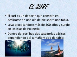 El surf es un deporte acuático que consiste en deslizarse sobre una tabla por las olas. Se ha practicado durante más de 500 años y surgió en las islas de Polinesia. Existen dos tipos básicos de tablas - shortboard y longboard - y varias categorías según el tamaño de la ola, como surf de olas grandes. El surf implica realizar diversas maniobras como take off, bottom turn, cut back y tubo.