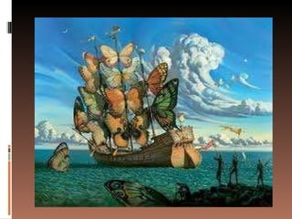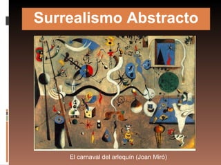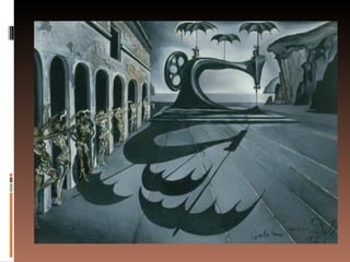 El documento describe los principales estilos y recursos del surrealismo, incluyendo el surrealismo abstracto, figurativo y obras de artistas como Dalí, Miró y Varó. Explica que el surrealismo se caracteriza por la animación de lo inanimado, el aislamiento de fragmentos anatómicos, elementos incongruentes, máquinas fantásticas y la metamorfosis.