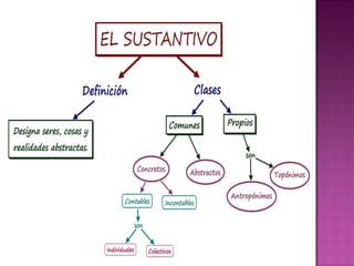 El documento describe dos clases de sustantivos: sustantivos comunes y sustantivos propios. Los sustantivos comunes se refieren a categorías generales como ciudad, perro o carro, mientras que los sustantivos propios se refieren a entidades específicas como Lima, Snoopy o Toyota.