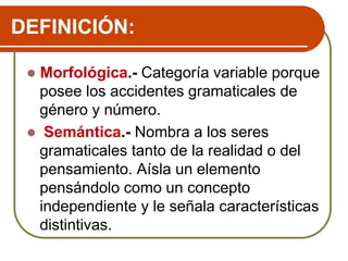 Este documento define el sustantivo y describe sus clases y accidentes gramaticales. Define al sustantivo como una categoría variable que nombra seres u objetos y funciona como núcleo en la oración. Explica que existen sustantivos propios y comunes, concretos y abstractos, derivados y no derivados, entre otras clases. También describe los accidentes de género y número que pueden afectar a los sustantivos.