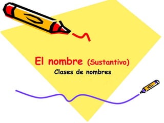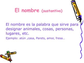 Este documento describe los nombres o sustantivos y sus clases. Explica que los nombres se usan para designar personas, animales, cosas y lugares. Describe dos clases de nombres: los nombres comunes, que designan cualquier cosa, y los nombres propios, que designan algo específico. También brinda instrucciones sobre cómo enumerar nombres y el uso de mayúsculas.