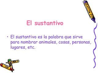 Este documento habla sobre los sustantivos, incluyendo las diferentes clases de sustantivos (común, propio, concreto, abstracto, individual, colectivo, patronímicos y gentilicios), el género gramatical (masculino y femenino) y el número (singular y plural). También explica las reglas para formar el femenino y el plural de los sustantivos.