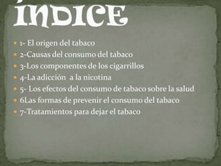 Este documento describe los orígenes y efectos del tabaquismo. Explica que el tabaco proviene de América y fue introducido en Europa en los siglos XV y XVI. Detalla los componentes dañinos de los cigarrillos como la nicotina y el alquitrán, y los efectos negativos del consumo de tabaco en la salud como el cáncer y las enfermedades pulmonares. También cubre formas de prevenir el consumo de tabaco y tratamientos para dejar de fumar.