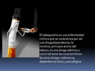El documento habla sobre el tabaquismo. El tabaquismo es una enfermedad crónica causada por la adicción a la nicotina en el tabaco. La nicotina crea dependencia física y psicológica y obliga a los fumadores a continuar consumiendo tabaco para evitar los síntomas de privación de nicotina. El tabaquismo tiene efectos dañinos para la salud de los fumadores y sus bebés.