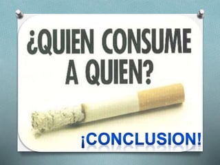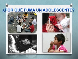 El documento habla sobre los efectos dañinos del tabaquismo en los niveles social, personal y económico. Presenta estadísticas sobre fumadores y ex fumadores en Sonora y México. Incluye los resultados de una encuesta aplicada a estudiantes sobre sus hábitos de fumar y factores influyentes. Explica los componentes tóxicos del tabaco y humo de segunda mano. Finalmente, propone concientizar a los jóvenes sobre los peligros del tabaco.
