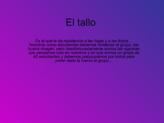 El tallo da resistencia a las hojas y frutos al igual que los estudiantes deben fortalecer al grupo dando una buena imagen. Desafortunadamente los estudiantes son egoístas y solo piensan en sí mismos en lugar de preocuparse por los 40 miembros del grupo para fortalecerlo.