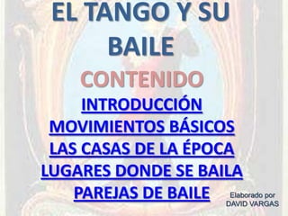 El documento describe el tango y su baile. Explica los movimientos básicos como la salida simple, el ocho y el retroceso. También describe los lugares donde se originó el baile del tango, como las academias y cafés, y las parejas de baile más importantes a través de los años.