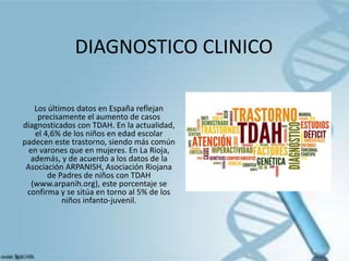 El documento describe el proceso de diagnóstico clínico del TDAH. Los profesionales médicos realizan una historia clínica que incluye una anamnesis mediante entrevistas con el paciente y sus padres sobre antecedentes familiares, síntomas y exploraciones físicas. También evalúan posibles comorbilidades y realizan una evaluación psicopedagógica. Usan escalas de diagnóstico del TDAH y de psicopatología general para identificar síntomas e intensidad y adaptan el diagnóstico