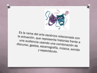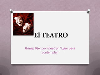 Este documento resume la historia del teatro en diferentes culturas y civilizaciones. Comienza con los orígenes del teatro en rituales religiosos en la antigüedad y cómo evolucionó a ceremonias dramáticas. Luego describe brevemente el teatro africano tradicional, el teatro en el antiguo Egipto como dramatizaciones con máscaras, y el teatro griego clásico con sus tragedias, comedias y uso de coros y máscaras. También menciona el desarrollo de la comedia del arte en Italia y varias formas de teatro religios