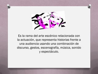 El teatro tiene sus orígenes en rituales mágicos y ceremonias religiosas. Se desarrolló en varias civilizaciones antiguas como Egipto, Grecia y las culturas prehispánicas de América. El teatro griego se presentaba al aire libre y contaba con coros y obras de tragedia y comedia.