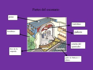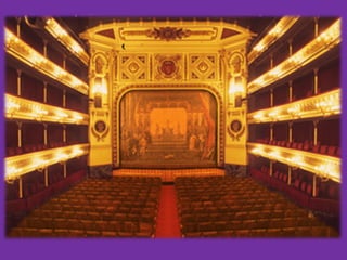 Este documento presenta el género dramático o teatral. Explica que el teatro es un género literario destinado a la representación escénica a través del diálogo entre personajes. Describe las características del género teatral, los elementos que componen el texto teatral y la representación, así como los componentes del espacio teatral como el escenario, proscenio y telón. Finalmente, contrasta un texto narrativo con su versión dramática.
