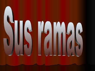 El documento describe las diferentes ramas del teatro y su historia. Algunas ramas del teatro mencionadas incluyen monólogo, mimo, parodia y teatro callejero. Además, señala que el teatro se considera que nació a partir de la evolución de los rituales sagrados y que representa historias utilizando discursos, gestos, escenografía, música, sonido y espectáculo ante un público.