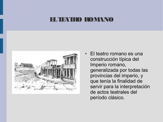 El teatro romano era una construcción típica del Imperio Romano utilizada para representaciones teatrales. Derivó de los teatros griegos con una estructura semicircular (cavea) para los espectadores dividida en secciones. La escena (scaenae frons) contaba con columnas y delante se situaba la orchestra. Los teatros romanos se extendieron por todas las provincias y algunos ejemplos notables son los de Mérida, Sagunto y Cartagena.