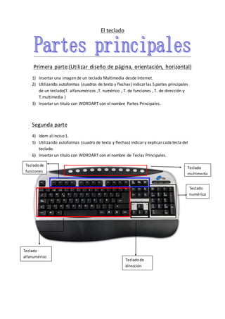 El documento describe las principales partes y teclas de un teclado, identificando el teclado alfanumérico, numérico, de funciones, multimedia y de dirección como las cinco partes principales. Explica las funciones de teclas como F1-F12, Alt, Ctrl, Shift, Tab, Enter, Delete, flechas y teclas numéricas.