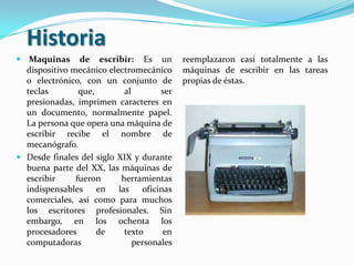 Un teclado es un periférico que permite introducir datos a un ordenador o dispositivo digital mediante un sistema de teclas similares a las de una máquina de escribir. El teclado Qwerty es la distribución más común de teclas, diseñada originalmente para evitar que los martillos de las letras chocaran en las primeras máquinas de escribir. Los teclados modernos cuentan con una variedad de teclas especializadas para funciones como mover el cursor, borrar, cambiar entre mayúsculas y minúsculas, y n
