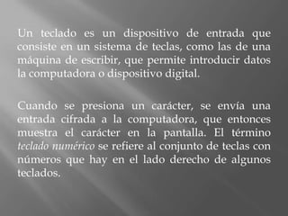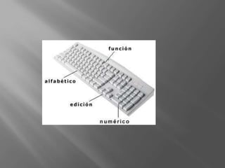 El documento describe los diferentes tipos y partes de un teclado. Explica que un teclado es un dispositivo de entrada que permite introducir datos a una computadora mediante teclas codificadas. Luego detalla las diferentes zonas de un teclado estándar como el alfabético, numérico, de edición y de funciones. Finalmente, menciona otros tipos de teclados como ergonómicos, multimedia e inalámbricos.