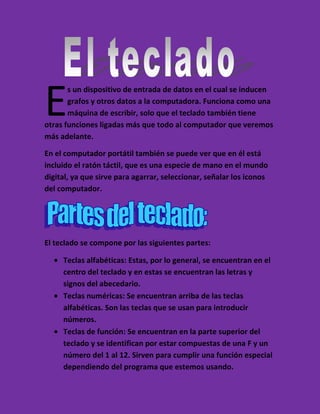 El documento describe las partes principales de un teclado de computadora, incluyendo teclas alfabéticas, numéricas, de función, de control y de desplazamiento. También menciona que el ratón permite seleccionar y señalar iconos en la computadora de manera similar a cómo una mano funciona en el mundo físico.
