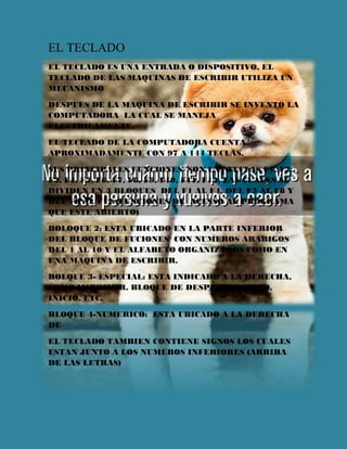 El teclado es una entrada o dispositivo que se utiliza en máquinas de escribir y computadoras para introducir datos. Los teclados de computadora tienen entre 97 y 144 teclas, incluyendo teclas numéricas, alfabéticas y de función como F1-F12. Las teclas se organizan en bloques para números, letras y funciones especiales como imprimir e inicio.