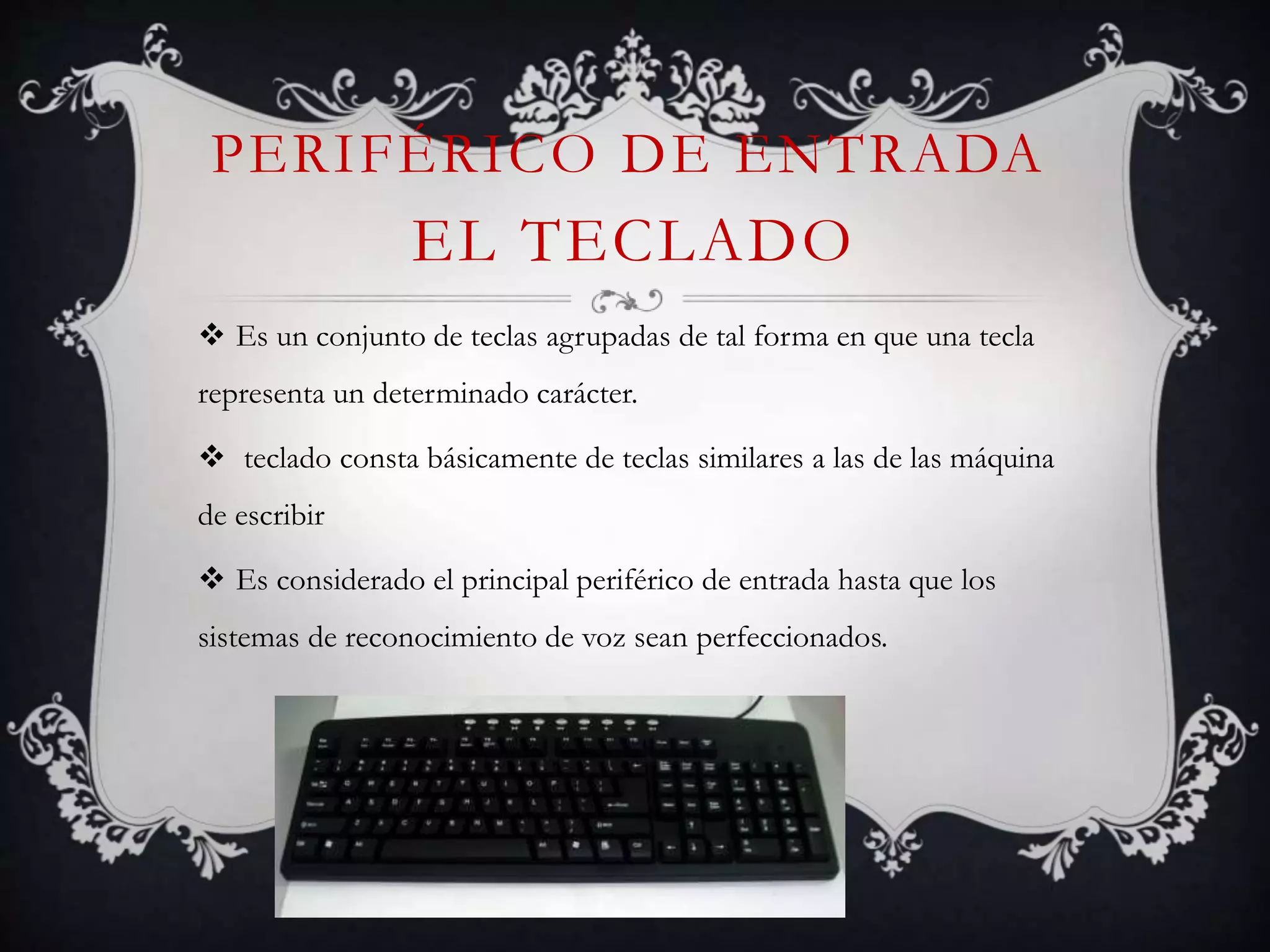 El documento describe diferentes periféricos de entrada para computadoras, incluyendo el teclado, mouse, escáner, sistema de reconocimiento vocal, cámara web, micrófono y lápiz óptico. El teclado permite introducir caracteres mediante teclas, mientras que el mouse facilita la navegación. El escáner digitaliza imágenes y el sistema de reconocimiento vocal reconoce comandos de voz. La cámara web captura imágenes para transmisión en línea, y el micrófono y lápiz óptico también sirven como métodos