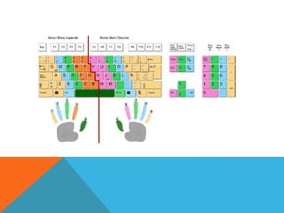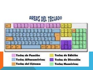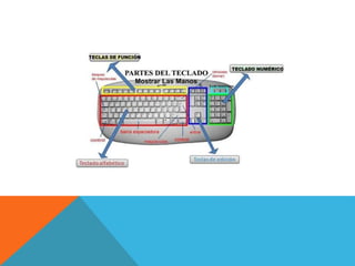 El documento habla sobre los integrantes de un equipo y las partes principales de un teclado. Describe la zona alfanumérica del teclado, que contiene letras, números y símbolos organizados en cinco filas. También describe los cuatro sectores del teclado: el bloque de funciones, el bloque alfanumérico, el bloque especial y el bloque numérico. Finalmente, menciona la importancia de la numeración de los dedos y la pulsación correcta de las teclas para una digitación eficiente.