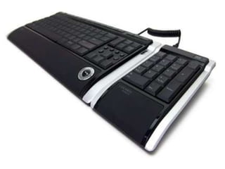 El documento habla sobre diferentes tipos de teclados como el básico, ergonómico, grafitero y para Palm. Explica que el teclado es un periférico de entrada de datos y que el más conocido es el de 101/102 teclas con orden QWERTY. También menciona que el teclado está dividido en cuatro secciones: alfanumérica, numérica, de control y de funciones.