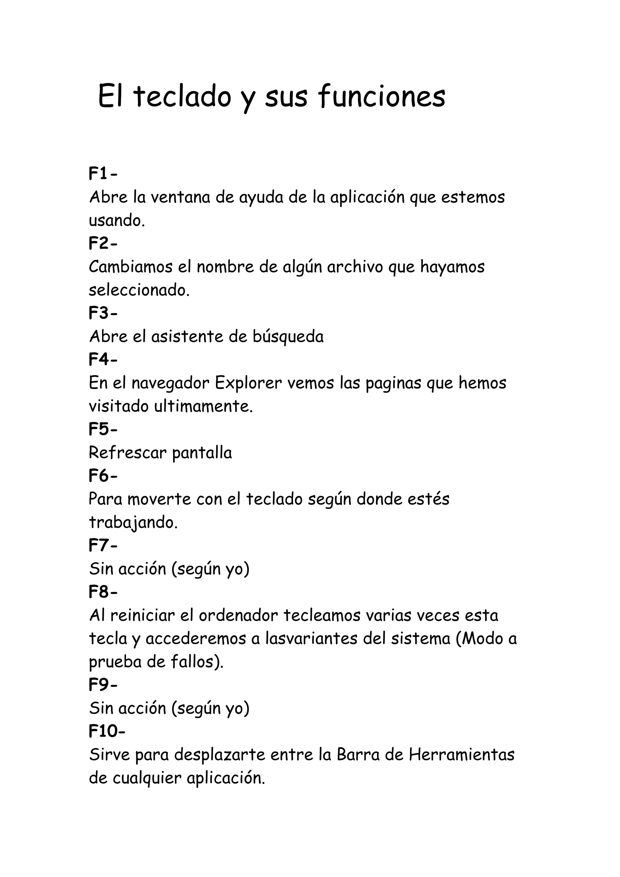 El documento describe las funciones de varias teclas de un teclado de computadora. Algunas teclas como F1, F3 y F5 tienen funciones específicas como abrir ayuda, buscar o refrescar la pantalla. Otras teclas como Ctrl, Alt y Shift no hacen nada por sí solas pero se usan en combinación con otras teclas para copiar, cortar, pegar y otras acciones. La tecla Windows abre el menú inicio y se puede usar junto con otras teclas para acceder a funciones como mostrar el escritorio, abrir el explorador o buscar arch