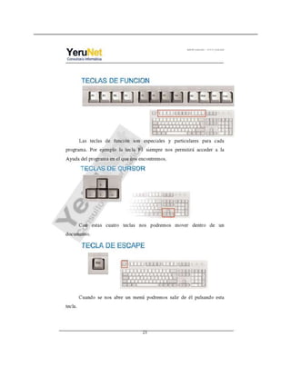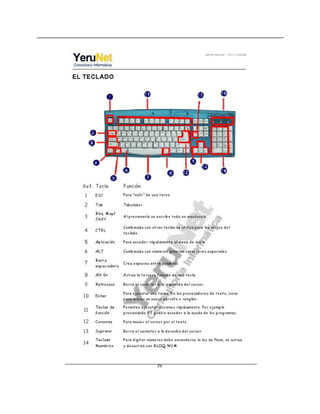 Este documento describe las funciones de las teclas de un teclado. Explica que la tecla ESC sirve para salir de tareas, la tecla TAB es el tabulador, y la tecla MAYÚS permite escribir en mayúsculas. También describe las funciones de las teclas CTRL, ALT, FLECHAS, y BORRAR, entre otras. Finalmente, proporciona instrucciones para descargar un programa llamado "keyboard explorer" que permite explorar y practicar con las teclas del teclado.