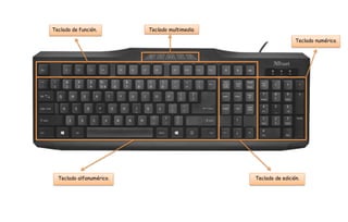 Este documento describe las funciones de varias teclas de un teclado de computadora. Explica que las teclas multimedia, de función, numéricas y alfanuméricas tienen funciones específicas cuando se combinan con otras teclas o solas. También describe las funciones de teclas como Espacio, Enter, Retroceso, Mayús y otras para realizar acciones como escribir, borrar, posicionar el cursor, imprimir, dar entrada a órdenes y más.