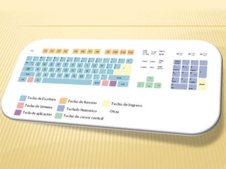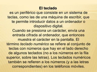 El teclado es un periférico que permite introducir datos a un ordenador mediante teclas, como en una máquina de escribir. Existen diferentes tipos de teclado según la disposición de las teclas, como el teclado QWERTY, AZERTY, Dvorak y teclados ergonómicos, braille, flexibles, inalámbricos o multimedia.
