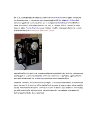 El documento discute la historia del teléfono. Explica que Antonio Meucci construyó un prototipo de teléfono en la década de 1850 pero no pudo patentarlo, y que aunque Alexander Graham Bell fue el primero en patentar el teléfono en 1876, el Congreso de EE.UU. luego reconoció a Meucci como el verdadero inventor. También describe los primeros sistemas de telefonía fija y móvil, incluido el desarrollo del primer teléfono móvil portátil comercializado por Motorola en 1984.
