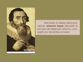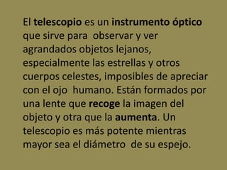 El telescopio es un instrumento óptico que permite observar objetos lejanos como estrellas y otros cuerpos celestes mediante el aumento de su imagen. Está formado por lentes o espejos que recogen y amplían la luz, siendo más potente cuanto mayor sea su diámetro. Galileo Galilei construyó el primer telescopio adaptado para la astronomía en 1609 y observó por primera vez los cráteres lunares y satélites de Júpiter. Existen diferentes tipos como refractores, reflectores y catadióptricos según su dise