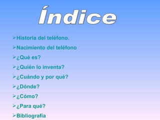 El documento resume la historia del teléfono. Explica que fue inventado por Antonio Meucci en 1857 pero no fue reconocido como el inventor hasta 2002, aunque originalmente se le dio el crédito a Graham Bell. Describe que Meucci construyó un dispositivo primitivo para comunicarse con su esposa que padecía de reumatismo entre el sótano y la habitación de ella. Explica también que el teléfono convirtió las señales de voz en señales eléctricas para transmitir el sonido a distancia.