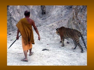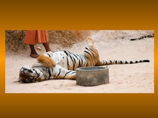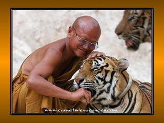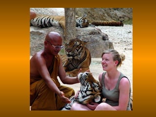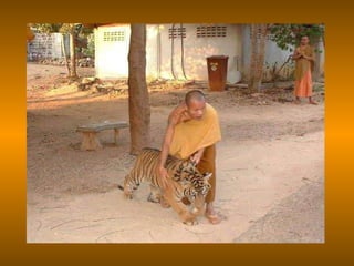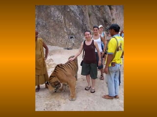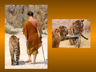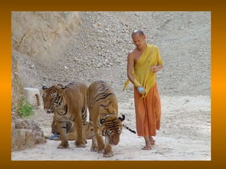 El templo budista Wat Pha Luang en Tailandia se ha convertido en un santuario para tigres huérfanos desde que en 1999 los monjes acogieron a dos crías cuyos padres habían sido cazados. Desde entonces, muchos más cachorros de tigre sin padres han sido llevados al templo, donde son cuidados y entrenados por los monjes para evitar que desarrollen el gusto por la sangre y poder interactuar con los visitantes, lo que ha convertido este lugar único en el mundo donde es posible acariciar a un t