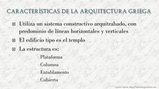 El documento describe la arquitectura de los templos griegos. Los templos utilizaban un sistema constructivo arquitrabado con predominio de líneas horizontales y verticales. Su forma más habitual era rectangular con un pórtico de columnas y cubierta exterior a dos aguas, a veces con una galería de columnas alrededor. Los templos griegos derivaban de antiguas cabañas de madera y adobe y evolucionaron hasta construirse en piedra.