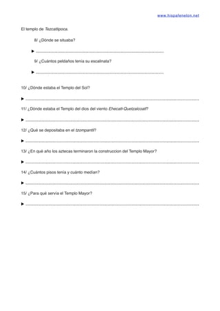 El documento proporciona preguntas sobre el Templo Mayor de México-Tenochtitlan. Algunas preguntas clave son: la ciudad fue fundada en una isla del Lago de Texcoco en el año 1325, y fue comparada con Venecia por los españoles. El recinto ceremonial del Templo Mayor tenía 100 metros de lado e integraba varios edificios. Hernán Cortés conquistó la ciudad en 1521.