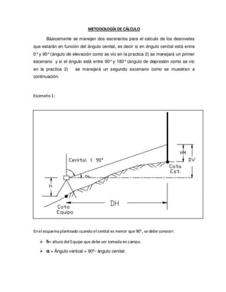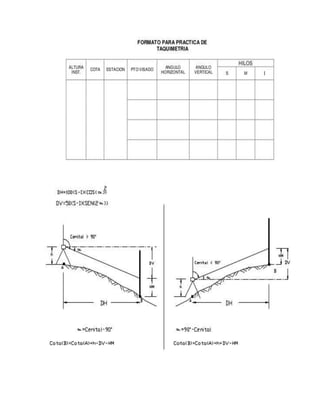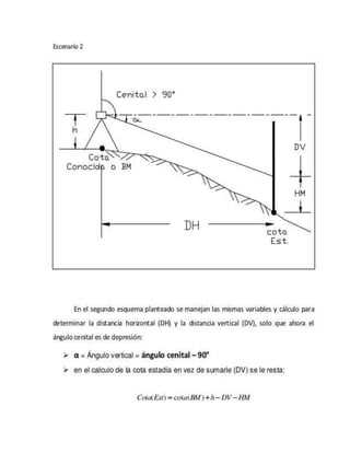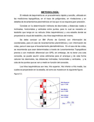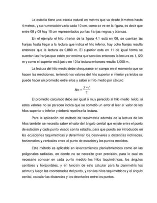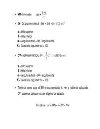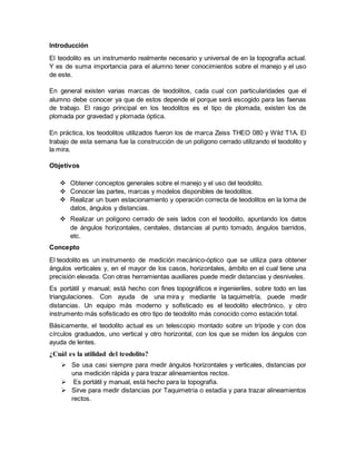 El teodolito es un instrumento óptico-mecánico utilizado para medir ángulos horizontales y verticales con precisión en topografía e ingeniería. Existen varios tipos de teodolitos como los repetidores, reiteradores y electrónicos. El teodolito tiene ejes principales y partes como los limbos graduados, niveles y plomada que permiten medir ángulos y orientar el instrumento correctamente.