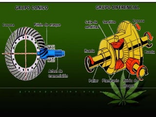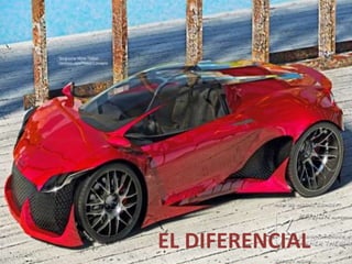 El documento describe el funcionamiento del diferencial, el elemento mecánico que permite a las ruedas de un vehículo girar a velocidades diferentes al tomar una curva. Explica que el inventor del diferencial fue el ingeniero inglés J.K. Starley en 1877 y describe sus componentes principales como el piñón de ataque, la corona y los satélites. También explica cómo permite que cada rueda reciba la misma fuerza del motor al girar a velocidades diferentes en una curva.