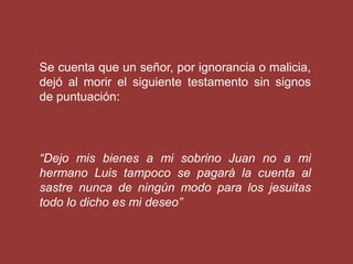 El testamento de un difunto carecía de puntuación, lo que generó confusión sobre a quién dejaba sus bienes. El juez convocó a posibles herederos (sobrino, hermano, sastre, jesuitas) para que aportaran versiones puntadas. Cada uno propuso una interpretación distinta que le beneficiaba. Ante la imposibilidad de aclarar el testamento, el juez decidió incautarse de la herencia en nombre del Estado.