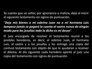El testamento de un señor carecía de puntuación, lo que llevó a múltiples interpretaciones por parte de posibles herederos como el sobrino, hermano, sastre y jesuitas. Ante la falta de claridad, el juez se quedó con la herencia para el estado.