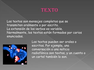 Los textos son mensajes completos transmitidos oralmente o por escrito que contienen toda la información necesaria para ser comprendidos. Los enunciados que componen un texto están relacionados entre sí y tratan del mismo tema. Existen diferentes tipos de textos como narrativos, descriptivos, dialogados, expositivos y argumentativos.