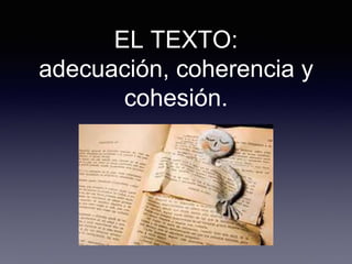 Este documento describe los elementos fundamentales que debe contener un texto para ser considerado adecuado, coherente y cohesivo. Explica que un texto debe ser adecuado al emisor, receptor y situación, así como coherente en su estructura y progresión temática, y cohesivo a través del uso de mecanismos lingüísticos como la referencia, deixis, sustitución y marcadores del discurso.