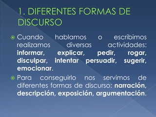 El documento resume los diferentes tipos de discurso que se pueden utilizar al hablar o escribir, incluyendo la narración, descripción, exposición y argumentación. Explica cada uno de estos tipos de discurso y proporciona ejemplos.