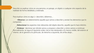 Este documento describe los diferentes tipos de descripción y los pasos para realizar una descripción efectiva. Explica que la descripción implica observar el objeto, seleccionar los aspectos más relevantes, y planear el orden de la descripción. También distingue entre descripciones objetivas y subjetivas, y cubre los diferentes tipos de descripción de personas, paisajes, épocas y periodos históricos.