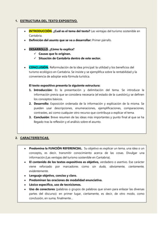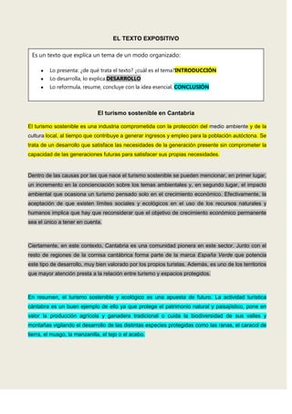 El documento presenta las características y ventajas del turismo sostenible en Cantabria a través de una estructura expositiva típica de tres partes: introducción, desarrollo y conclusión. La introducción define el turismo sostenible y establece el tema. El desarrollo explica las causas de su surgimiento y sitúa a Cantabria como pionera en este sector. La conclusión resalta que es una apuesta de futuro y ejemplifica cómo la región protege el patrimonio natural y fomenta actividades tradicionales.