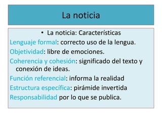 El documento proporciona información sobre el texto informativo y la noticia. Explica que el texto informativo transmite hechos de actualidad de manera objetiva e impersonal para orientar la opinión pública, mientras que la noticia tiene características como un lenguaje formal, objetividad, coherencia y estructura de pirámide invertida. Además, detalla los elementos básicos que debe contener una noticia como qué, quién, cuándo, dónde, por qué y cómo ocurrió un evento.