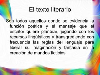 Este documento resume los tres principales tipos de textos literarios - narrativos, líricos y dramáticos. Los textos narrativos se escriben en prosa y tienen un narrador que relata los acontecimientos, creando un mundo ficticio. Los textos líricos expresan sentimientos y emociones a través de la poesía. Y los textos dramáticos se presentan en forma de diálogo y representan una historia a través de personajes y conflictos.