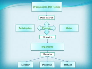 Este documento habla sobre la organización y manejo efectivo del tiempo. Explica que la planificación del tiempo a través de horarios nos permite lograr prioridades y objetivos mediante estrategias de manejo de imprevistos y actividades de manera comprensiva y creativa. También destaca la importancia de establecer hábitos de estudio como evitar distracciones y escoger un buen lugar para estudiar.