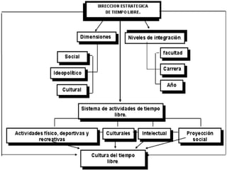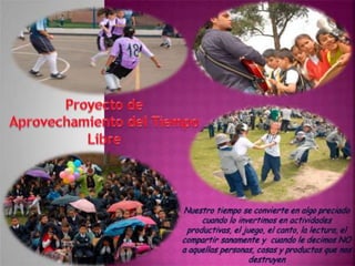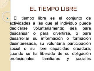 El documento habla sobre el tiempo libre. Define el tiempo libre como el conjunto de actividades a las que una persona puede dedicarse voluntariamente cuando se ha liberado de sus obligaciones laborales, familiares y sociales. Explica que el tiempo libre es una ocupación elegida libremente que resulta satisfactoria para el individuo. Resalta la importancia de aprovechar el tiempo libre en actividades formativas que ayuden a prevenir problemas como la depresión, el aislamiento y las enfermedades. Finalmente, incluye algunas frases sobre la relación entre el tiempo
