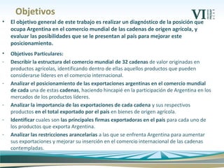 El documento analiza la posición de Argentina en el comercio mundial de 32 cadenas agroindustriales. Se encontró que Argentina participa principalmente en cadenas con bajos flujos comerciales y en productos con menor grado de elaboración. Asimismo, exporta principalmente de cadenas y productos con menores valores unitarios a nivel mundial. Por lo tanto, el documento concluye que Argentina tiene potencial para mejorar su posicionamiento exportando una mayor variedad de cadenas líderes y bienes de mayor valor agregado.