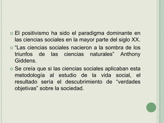 1) El documento analiza las limitaciones del positivismo como paradigma dominante en las ciencias sociales durante el siglo XX y propone que la teoría del tipo ideal de Max Weber ofrece una alternativa metodológica más adecuada.